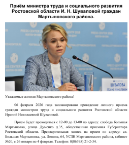 6 февраля 2026 года с 12.00 до 13.00 министр труда и социального развития Ростовской области И.Н.Шувалова. Предварительная запись по адресу: сл. Б. Мартыновка, ул. Ленина, 64, УСЗН Мартыновского района, каб.№20. Телефон: 8(86395) 21-2-34